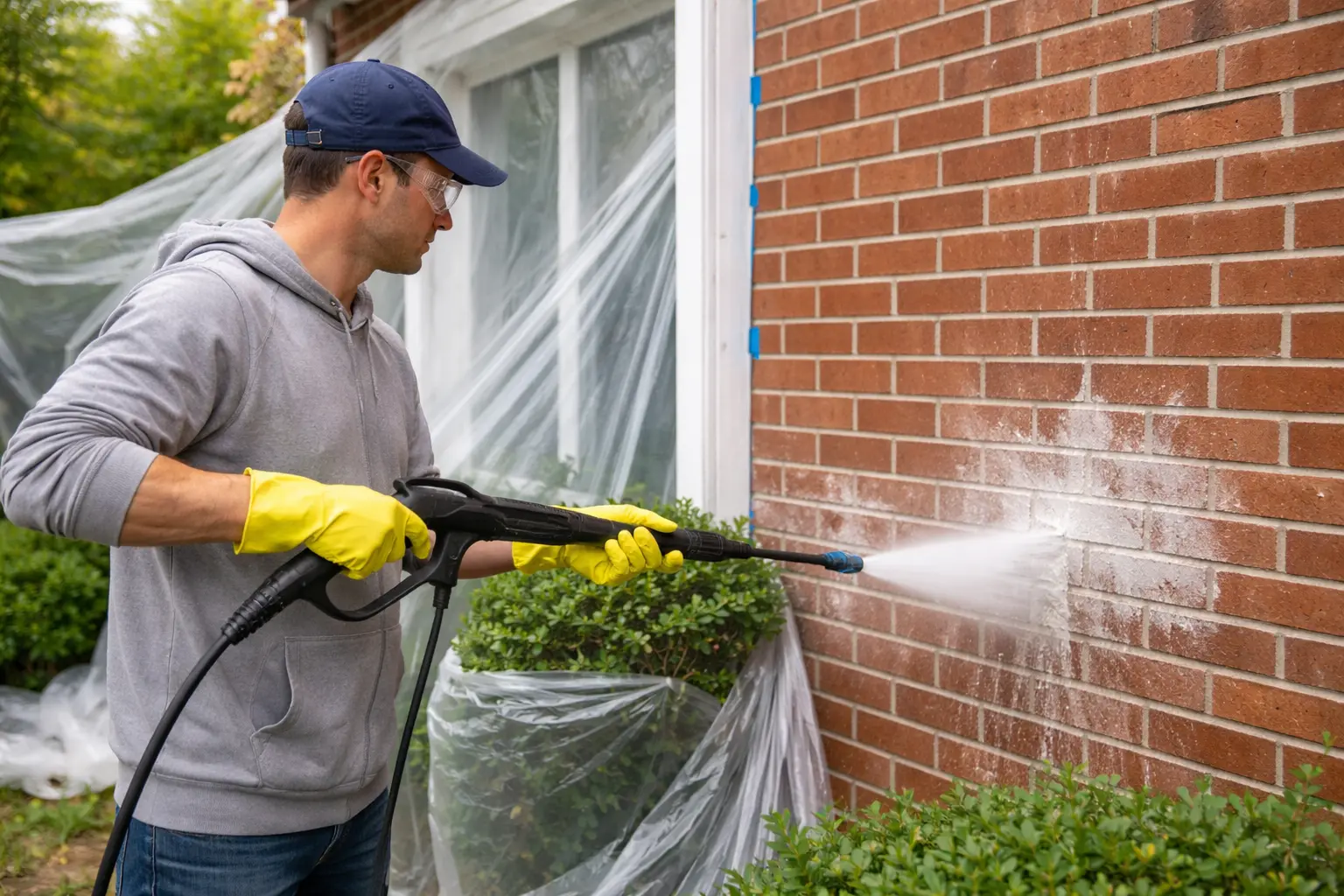 Key steps Wear protective gear such as rubber gloves and goggles. Cover plants, bushes and window and door frames before cleaning. Use a pressure washer for removing salt residue from